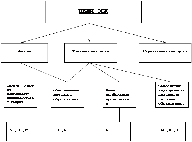 В данном примере представлен пример системы методом смешанного графа. Т.е. в этом графе присутствуют как направленные так и ненаправленные связи. Является наиболее общим случаем графа. II. Одной из причин, объясняющей, почему ЭБК является прибыльной организацией, заключается в очень упорной работе собственников и сотрудников фирмы. Стремление к лидерству и качество команды позволили поставить перед собой широкий набор целей, которые должны соответствовать постоянно меняющимся требованиям на рынке образования. Миссия ЭБК состоит в том, чтобы предоставить самый широкий и качественный спектр услуг по подготовке-переподготовке специалистов по представленным сертифицированным специальностям. Стратегическая цель ЭБК - Завоевание лидирующего положения на рынке образования за счет расширения списка специальностей и качества обучения. Тактические цели: ² Быть прибыльным предприятием и использовать полученные средства для новых инвестиций по мере возникновения возможностей; ² Отобрать и принять на работу новых педагогов и кураторов, усвоивших принципы самомотивации, ориентированных на успехи и привыкшие к упорной работе; ² Иметь в ЭБК достаточное количество педагогического состава, удовлетворяющих указанным требованиям; ² Завоевать для нашей фирмы на целевом рынке имидж солидной организации; ² Разработать комплекс льгот по оплате обучения для детей инвалидов, неполноценных семей и семей с низким уровнем доходов; ² К концу пятого выпуска получить государственную аккредитацию (июнь-август 2001 года). Рис.6 Дерево целей: