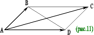 с = АВ (рис.10). Тогда с = а – в, и мы имеем (учитывая, что угол между векторами а и в равен С): с2 = ( а – в )2 = а2 – 2ав + в2 = а2 – 2ав х соs С + в2. Задача 4. Докажите, что сумма квадратов диагоналей параллелограмма равна сумме квадратов его сторон. Решение. Пусть четырехугольник АВСD – параллелограмм (рис.11). Имеем векторные равенства