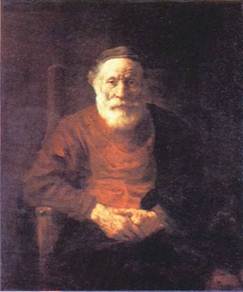 Ми не знаємо імені людини, що послужили моделлю для портрету «Старий у червоному». Рембрандт писав його двічі: у портреті 1652 року (Національна галерея, Лондон) він зображений сидячим в кріслі з підлокітниками, у глибокій замисленості склонившим голову на праву руку; ермітажний варіант трактує ту ж тему – людина наодинці зі своїми думами. Цього разу художник застосовує строго симетричну композицію, зображуючи нерухомо сидячого старого у фас. Але тим помітніше рух думки, ледь уловима зміна виразу обличчя: воно здається то суворим, то більш м'яким, то втомленим, то раптом осяяним припливом внутрішньої сили й енергії. Те ж відбувається і з руками: вони здаються то судорожно стиснутими, то лежачими знесилено. Художник досягає цього насамперед завдяки блискучій майстерності світлотіні, що у залежності від її сили і контрастності вносить у зображення елегійну розслабленість або драматичну напругу. Величезну роль грає при цьому і манера нанесення фарби на полотно. Порите зморшками обличчя старого і вузлуваті натруджені руки знаходять художню виразність завдяки грузлому місиву фарб, у якому жирні мазки, що переплітаються, передають структуру форми, а тонкі лесировки додають їй рух і життя. Безіменний старий у червоному з підкресленим достоїнством, силою духу і шляхетністю став вираженням нової етичної позиції художника, який відкрив, що цінність особистості не залежить від офіційного положення людини в суспільстві.