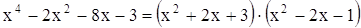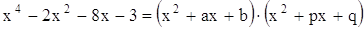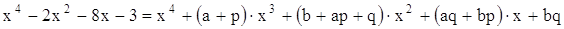 Представим левую часть в виде произведения двух квадратных трехчленов с неизвестными (неопределенными) коэффициентами: