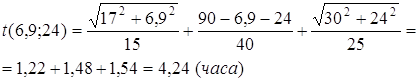При вычислении значения t на границе, значения получаются больше, чем 4,24 часа. Следовательно, оптимальное решение будет при х = 6,9 км, у = 24 км,