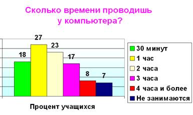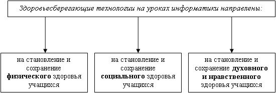 Неблагоприятное воздействие работы на компьютере на здоровье изучено достаточно хорошо. Основные вредные факторы при работе за компьютером: · Стесненная поза, сидячее положение в течение длительного времени. Длительное неизменное положение тела у пользователя ПК вызывает мышечно-скелетные нарушения. · Воздействие электромагнитного излучения. · Утомление глаз, нагрузка на зрение. Пользователь ПК читает не отраженные тексты, как при обычной работе с бумагой, а смотрит на источник света — монитор. Его глаза перебегают с листа на экран и обратно. Тысячи раз в день наше зрение должно перестраиваться с одного способа чтения на другой. · Перегрузка суставов кистей. · Стресс при потере информации. · Психические расстройства. При проблемах в реальной жизни, в общении с другими людьми ребенок ищет то, что ему не хватает в книгах, просмотрах TV, компьютере... Поэтому, к вышеперечисленным требованиям к уроку с позиции здоровьесбережения хотелось бы сделать дополнения, касающиеся компьютерного урока. 1) Правильная посадка за столом при работе на ПК 2) В помещениях с ПК должны обеспечиваться оптимальные параметры микроклимата, т.е. при температуре 19 - 210С относительная влажность воздуха должна быть соответственно 62 - 55% (допускается температура 18 - 220С и относительная влажность 39 -31%) 3) Для повышения влажности воздуха в помещении с ПК следует применять увлажнители воздуха, заправляемые дистиллированной или прокипяченной водой 4) Помещение с ПК перед началом и после каждого урока должны быть проветрены 5) Соблюдение требований к монитору: количество цветов не менее 256; размер зерна не более 0,28 мм; возможность регулировки яркости и контраста изображения; монитор должен находиться на расстоянии не менее 60 см от глаз; чаще протирать экран монитора 6) Освещение рабочего места не должно вызывать блики на экране монитора. В то же время оно должно быть достаточным, для того чтобы хорошо видеть остальные предметы, с которыми работаем. 7) Для предупреждения переутомления включать следующие упражнения: для снятия общего напряжения; для мозгового кровообращения; для снятия утомления плечевого пояса и рук, туловища и ног; для пальцев рук; для снятия усталости глаз (например, цветотерапия, разминка по методике Базарного В.Ф. и т.д.) 8) Для учителей общеобразовательных школ устанавливается длительность работы в компьютерных классах не более 4 часов в день. Продолжительность непрерывной работы с ПК без регламентированного перерыва не должна превышать 2 часа. Для учащихся: для учащихся 1 классов (6 лет) – 10 минут, для учащихся 2 - 5 классов – 15 минут, для учащихся 6 - 7 классов – 20 минут, для учащихся 8 - 9 классов – 25 минут. Несмотря на вышесказанное здоровьесберегающие технологии имеют ещё два направления.