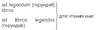 Accusat+vus герундия употребляется с предлогом ad (иногда с предлогом ob) в значении цели действия: ad legendum для чтения. Ablat+vus герундия употребляется: · в значении ablat+vus modi или ablat+vus instrumenti: Gutta cavat lapidem non vi, sed saepe cadendo. - Капля долбит камень не силой, а частым падением;