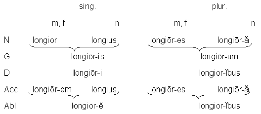 longus, a, um длинный; G. sing. long-i; основа long-. Сравнительная степень: m - long - ior, f - long - ior, n - long - ius; brevis, e краткий; G. sing. brev-is, основа brev-. Сравнительная степень: m - brev - ior, f - brev - ior, n - brev - ius. Сравнительная степень изменяется по III согласному склонению: