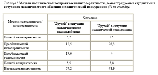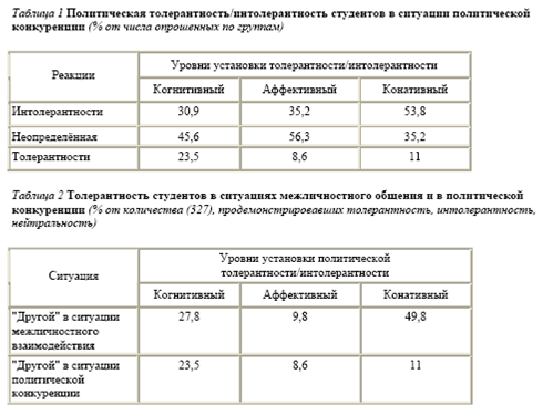 Статья: Особенности политической толерантности студенчестваСтатья: Особенности политической толерантности студенчестваС. М. Елисеев, И. В. Устинова, Санкт-Петербургский государственный университет Многообразие интересов и мнений людей в современном обществе априори содержит в себе потенциал конфликтности и напряженности, что актуализирует ценность толерантности в политических взаимодействиях между социальными группами и индивидами. Студенчество как часть социальной группы молодёжи характеризуется специфическими чертами, среди которых - большая политическая активность и вовлеченность в общественные процессы. В ходе проведения в 2008 - 2009 гг. эмпирического исследования в Мурманской области мы поставили задачу изучить особенности политической толерантности этой группы молодежи, а также контекст и особенности её проявления. Специфика политической толерантности. Понятие "толерантность" до сих пор вызывает дискуссии в содержательном плане, что создает трудности для исследователей-эмпириков при операционализации этого термина. Произведя анализ различных дефиниций, мы остановились на трактовке, которая закрепляет за "толерантностью" уважение культурных отличий - верований, образа жизни, ценностей и т.п. "другого", "иного". Толерантности или интолерантному отношению всегда предшествует процесс социальной идентификации и социальной категоризации, когда человек начинает дифференцировать "своих" и "чужих" ("других"). Особое место занимает политическая толерантность в контексте общей толерантности. Среди ее дефиниций следующее определение, на наш взгляд заслуживает внимания: "В политическом плане толерантность интерпретируется как готовность власти допускать инакомыслие в обществе и даже в своих рядах, разрешать в рамках Конституции деятельность оппозиции, способность достойно признать свое поражение в политической борьбе, принимать политический плюрализм как проявление разнообразия в государстве" [1]. М. Мацковский трактовал политическую толерантность как "отношение к деятельности различных партий и объединений, высказываниям их членов и т.д., где крайними формами проявления политической интолерантности являются: фашизм и свойственная тоталитарным режимам политика политических репрессий" [2]. В приведенных определениях имеется в виду, прежде всего, политическая толерантность, относящаяся к политической элите, "власть предержащим". Более широкое определение указанного понятия даёт Е. Б. Шестопал - терпимость к политическим оппонентам и политической оппозиции вообще [2]. Г. М. Денисовский и П. М. Козырева выделяют два аспекта политической толерантности: во-первых, на уровне взаимодействия политических сил она проявляется как признание права оппозиции на существование; во-вторых, в жизни отдельной личности - как готовность прислушаться к мнению политических противников [3, с. 9]. Политическая толерантность - это толерантность в сфере политики, что и определяет во многом ее специфику. Опираясь на идеи конфликтологической парадигмы, основу которой сформировали Р. Дарендорф и Л. Козер, политику можно представить как конфликт, борьбу, в которой те, кто обладает властью, обеспечивают себе контроль над обществом и получение благ. Так ее характеризуют видные представители конфликтологического направления К. Шмитт [4, с. 