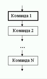 Рис.2. Лінійна базова структура алгоритму Існує чотири базових структури алгоритмів: лінійні; розгалужені; циклічні; змішані. Найпростіша в написанні та виконанні перша з цих структур - лінійна До неї відносяться алгоритми, що складаються лише з простих команд, які виконуються безумовно, тобто після першої команди виконується друга, потім третя і тощо. Набагато частіше зустрічається другий тип алгоритму - розгалуження (рис.3). Цей алгоритм обов'язково містить у собі хоча б одну умову (зазвичай їх набагато більше), і виконується він залежно від умови.