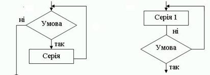 Умовою називається таке речення, на яке можна дати відповідь "так" чи "ні". Як правило, кажуть, що в першому випадку (коли ми відповіли на речення "так") умова є істинною, а в другому - хибною. Виходячи з цього, речення "Якого кольору твій піджак?" не можна вважати умовою, а речення "Твоє волосся русяве?" - можна. Однак, навіть маючи в своєму арсеналі команду розгалуження, важко реалізувати алгоритми, що потребують багаторазового повторення деякої послідовності однакових дій. У цих випадках нас виручає циклічний алгоритм. У нашому житті дуже часто зустрічаються алгоритми з повторами, причому чітко визначаються два типи повторів. Залежно від того, чи знаємо ми скільки разів необхідно повторити якусь послідовність команд, розрізняють цикли з лічильником (кількість повторень відома заздалегідь) та цикли з умовою (цикл повторюється доти, доки не виконається якась умова). Крім того, в циклах з умовою теж можна виділити два різних випадки (рис.4): цикл з передумовою - коли ми спочатку перевіряємо умову, а потім виконуємо деяку послідовність дій (так, ми спочатку перевіряємо, чи вимита підлога в тій класній кімнаті, де нам потрібно чергувати, а потім починаємо прибирання); цикл з післяумовою - спочатку ми виконуємо хоч один раз певну послідовність дій, а потім перевіряємо, чи не досягли ми бажаного результату (коли ми хочемо пити, ми спочатку робимо хоча б ковток води, а потім починаємо контролювати, чи не вгамували ми свою спрагу).