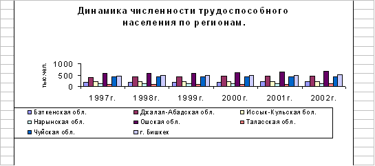 Рис. 2 Поэтому в Кыргызской Республики каждый год вступает в рабочий возраст гораздо больше людей, чем выбывает из него. В результате идет рост трудоспособного населения, который наблюдается по всем регионом республики (рис. 3). Таблица 6 - Трудоспособное население Кыргызской Республики