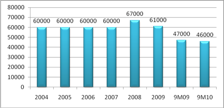 Мощности НХК позволяют обеспечивать добычу природного газа в объеме 60-70 млрд. кубометров и жидких углеводородов в объеме до 8 млн. т. Причиной снижения добычи являются следующие: · Снижение пластового давления, что не позволяет сегодняшним технологиям производить добычу. · Запасы углеводородов с каждым годом иссякают, а новые месторождения не разрабатываются. · Существующие скважины низкодебетные и не дают больших объемов. Можно отметить, что среди прочих продуктов, производство топливных ресурсов сокращается. К примеру, производство бензина и дизельного топлива сократилось на 11% и 14% соответственно в период с 3 квартала 2009 и 3 квартала 2010.