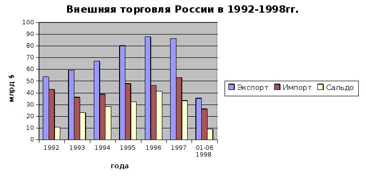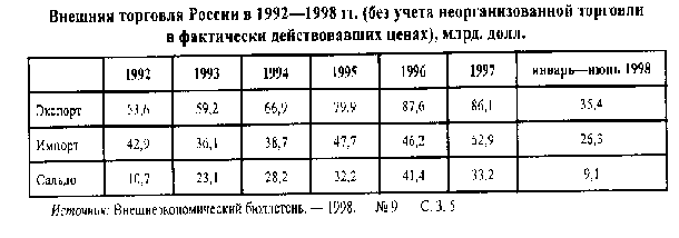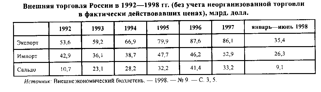 Резкое сокращение положительного сальдо торгового баланса России в начале 1998 г. явилось одной из основных причин ухудшения ее валютного положения. Соответственно возросший спрос на иностранную валюту (в первую очередь на доллары США) привел к дестабилизации и обвалу курса рубля летом и особенно осенью 1998 г.1 Снижение курса национальной валюты не только немедленно сказалось на российской внешней торговле, но и окажет значительное долгосрочное влияние на ее динамику и структуру. Импорт, особенно из стран дальнего зарубежья, имеет тенденцию к снижению (так, например, за август-октябрь текущего года импорт продовольствия уже сократился в шесть раз)2. Показатели взаимовыгодной торговли между странами СНГ. Для большинства бывших союзных республик торговля в рамках СНГ остается основным каналом реализации экспортной продукции и импорта недостающих товаров, причем ведущее место в этой торговле продолжает занимать Россия. Так, в 1996 г. товарооборот России с Украиной, например, превышал весь объем украинской торговли с дальним зарубежьем в 1,6 раза, аналогичное соотношение, для Беларуси составляло 2,8 раза, Казахстана - 3,3 раза.