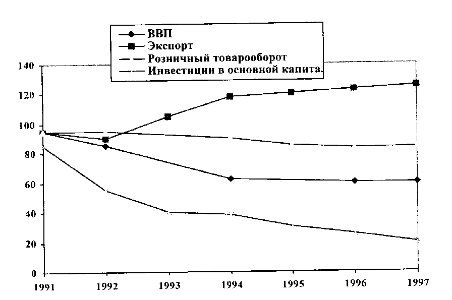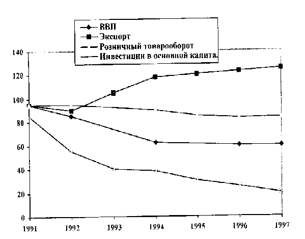 Источник: МЭ и МО №9, 1998 с. 129 Другим важным итогом ускорения экономических реформ явилось достижение в 1996 г. финансовой стабилизации. Либерализация цен в 1992 г. вызвала гиперинфляцию в стране, однако лишь в 1994 г. начала проводится действенная антиинфляционная политики. В результате темпы роста цен снизились с 400% в 1992 г. до 40% в 1996 г. Ситуация оставалась достаточно стабильной и на протяжении 1997 г. Ежемесячные темпы инфляции снизились с 2.2% в январе до 0.9% в октябре. Снижение инфляции благотворно сказалось на стабилизации курса национальной валюты по отношению к доллару. В сентябре 1996 г. была проведена денежная реформа. Суть ее состояла в фактической деноминации в 100 тыс. раз ходившего тогда в обращении карбованца и замене его гривной. На Украине, хотя и с некоторым опозданием, начал развиваться рынок ценных бумаг. Сейчас он представлен рынком государственных ценных бумаг и фондовым рынком. Экономическая ситуация в Украине в 1997 г. в целом отражает тенденции, сложившиеся в республике за последние годы. По предварительным данным Госкомстата Украины, ВВП равнялся 90.2 млрд. гривн (1 долл. = 1.9 гривны), или ниже, чем в предыдущем году, на 3.2%. Объемы производства промышленной продукции составили 73.5 млрд. грн., сельскохозяйственной -28.3 млрд. Сводный бюджет за 1997 г. был сведен с дефицитом в 5087.9 млн. грн. (6.4% ВВП). На его покрытие затрачено 4131.4 млн. грн. из внутренних источников финансирования и 1501.9 млн. внешних займов. Индекс потребительских цен в 1997 г. по сравнению с 1996г. возрос до 116.7%. Среднемесячная заработная плата составляла 159.9 грн. Меры, предпринятые правительством в области макроэкономической стабилизации - либерализация цен, валютного курса, внешнеэкономической деятельности - дали положительные результаты. Это нашло отражение в уменьшении темпов падения ВВП. Если до 1994 г. ВВП постоянно сокращался, то в 1995г. впервые это сокращение не превысило уровень предыдущего года. Те же тенденция имела место и в 1996 г. В 1997 г. темпы падения ВВП еще более замедлились - 3.2% против 10.1 % в 1996 г. Несмотря на некоторую стабилизацию производства, наметившуюся в 1997 г. в ряде отраслей, финансовое положение большинства промышленных предприятий остается крайне тяжелым. В 1997 г. убыточным было каждое второе предприятие (в 1995 г. - каждое пятое, в 1990 г. -каждое одиннадцатое). Общая сумма убытков достигла 5 млрд. грн. За год кредиторская задолженность возросла в 1.4 раза (70% - просроченная) и превысила ВВП на треть При этом платежная дисциплина практически отсутствует, а на бартерные операции приходится почти половина оборота товаров и услуг. Главная причина перехода украинских предприятий на бартер, как и в других странах СНГ, -удручающее состояние их оборотных средств и особенно острая нехватка наличности. С другой стороны, предприятия не могли пополнять свои оборотные средства за счет кредита, так как ставки были непосильны для большинства из них. В результате доля кредитов в финансировании инвестиций сократилась с 49% ВВП в 1992 г. до 5% в 1996 г. Важной причиной роста бартерных операций является действующая налоговая система. Она вынуждает предпринимателей, которые в принципе имеют возможность рассчитываться "живыми" деньгами, идти на осуществление товарообменных операций, ибо только так они могут ослабить действие налогового пресса. Другой причиной бартеризации является резкое па
