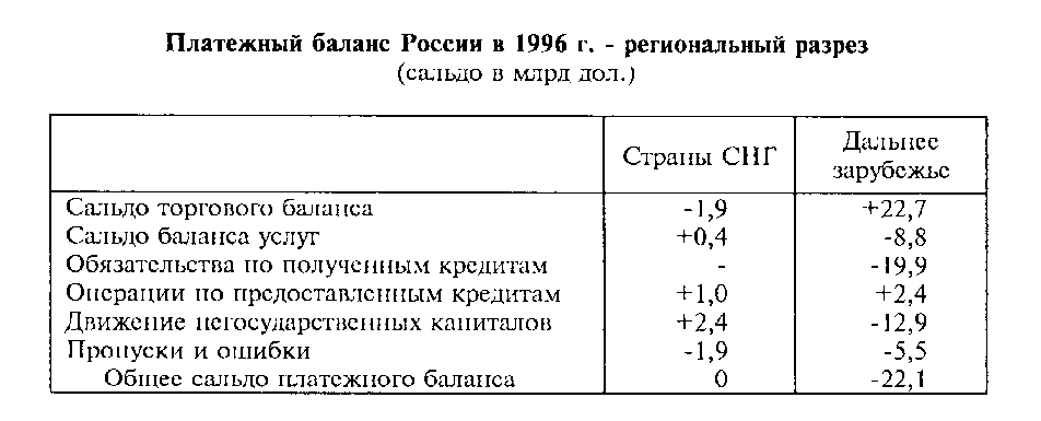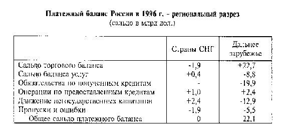 Особенностью 90-х годов стало выделение нового сектора внешней торговли России - товарооборота со странами СНГ (с 1994 г. его объем учитывается в долларах США и включается в общий внешнеторговый оборот страны). В 1995 г доля стран СНГ во внешнеторговом обороте России составила 21,9%. Крупнейшими торговыми партнерами ныне являются Украина ( 8,5% экспорта и 14,2% импорта России), Белоруссия (3,7 и 4,2), Казахстан (3,3% экспорта и 5,9% импорта). Показатели торговли с другими государствами СНГ значительно уступают лидирующей тройке. Так, на Азербайджан приходится 0, 1 % экспорта и 0,2 % импорта России, Армению - 0,2 и 0,2, Грузию - 0,6 и 0,1, Киргизию - 0,1 и 0,2, Молдавию - 0,5 и 1,4, Таджикистан - 0,2 и 0,4, Туркмению - 0,1 и 0,2, на Узбекистан - 1% и 1,9% соответственно22. Характерно, что в отличие от внешней торговли России в целом в данном секторе российский импорт растет быстрее экспорта. Сокращение положительного сальдо России в торговле со странами СНГ означает уменьшение задолженности последних по отношению к РФ. Роль стран СНГ как рынков сбыта существенна лишь в ряде секторов внешней торговли России. Так, в эти страны экспортировалось: каменного угля в 1995 г 28,2%, в l996 г. - 20,6%, соответственно, природного газа- 27,1 и 31,6, синтетического каучука- 27,7 и 27,9, газетной бумаги 12,4 и 16,4, нефтепродуктов - 9,5 и 4, пиломатериалов - 9,8 и 13,9, черных металлов - 7,4 и 6,7, чугуна - 3,5% и 5,3%.23 В структуре российского импорта возросла (почти на треть по сравнению с 1991 г.) доля продовольствия и сельскохозяйственного сырья, превысившая в середине 90-х годов 35%. Среди товаров российской импортной номенклатуры выделяются: алкогольные и безалкогольные напитки (в 1995 г. - 4,2% импорта, в 1996 г. - 2,3%), сигареты (1,1 и 0,9), мясные консервы (1 и 0,5), сахар белый (1,7 и 1,5), сахар-сырец (1,0 и 1,3), мясо птицы (1,5 и 1,1), свежемороженая рыба (0,4 и 0,5), сливочное масло (1,0 и 0,5), цитрусовые (0,5 и 0,4), зерновые культуры (0,9 и 0,3), подсолнечное масло (0,5 и 0,3), шоколадные изделия (0,9% и 0,4%). Значителен импорт таких товаров как медикаменты (2,2% в 1995 г. и 2,5 % в 1996 г.), мебель ( 1,6 и 1,2), одежда ( 1,3 и 0,9), кожаная обувь (0,6% и 0,3%)24. Основными поставщиками в Россию машин, оборудования и транспортных средств остаются страны дальнего зарубежья, в то время, как доля стран СНГ в российском импорте данной продукции сокращается (5,6% в 1995 г., 4,7% в 1996 г) 25. Россия продолжает ввозить такие товары производственно-технического назначения, как железо, сталь прокат (1,8% импорта в 1995 г. и 2,2% в 1996 г.) и трубы стальные (1,6% и 2%). Основными поставщиками товаров по последним двум позициям выступают государства СНГ, на долю которых приходилось в 1995 г. 78,7 %, а в 1996 г. - 77,6 % российского импорта железа, стали и проката, а также соответственно 55 % и 63,3 % стальных труб26. Удельный вес экспортно-импортных операций со странами СНГ общем объеме товарооборота России возрос с 18 % в 1992 г. до 23 % в 1997 г. Более 80 % его приходится на три государства - Украину, Казахстан и Белоруссию.27 Ряд особенностей характеризуют нынешнее состояние платежно-расчетных отношений России со странами, входящими в СНГ. Взаимный экономический обмен находится на очень низком уровне, причем несмотря на бесконечные разговоры о необходимости усиления интеграции положение практически не меняется. Объем торговли со странами СНГ в 3 раза меньше, чем с дальним зарубежьем, а валютный оборот, если судить по суммарному итогу кредитовых и дебетовых статей платежного баланса, - п