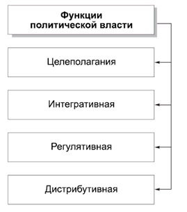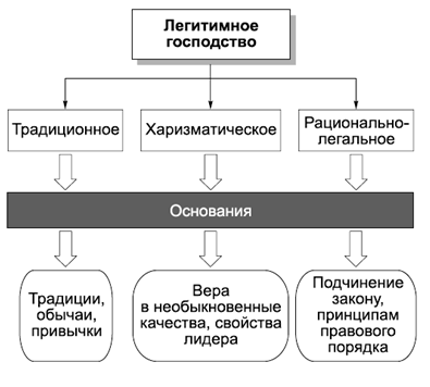 Рис.3.1 - Типология легитимного господства по М. Веберу1 Понятие «легитимность», введенное в политологию М. Вебером, трактуется как правомочность власти, ее поддержка со стороны общества, проявление лояльности к власти со стороны граждан. Вебер утверждал, что характер легитимности власти (господства) определяет ее природу. Согласно веберовской теории, существуют три типа легитимного господства. Традиционный тип господства характеризуется подчинением общества власти в силу традиций, обычаев и привычки. Основными разновидностями традиционного господства ученый считал патриархальную и сословную. Патриархализм (существовавший еще в Византии) отличался личным характером господства. Как правило, подданные непосредственно зависели от воли своего владыки, который осуществлял непосредственный контроль за исполнением своих распоряжений. Однако по мере расширения географического пространства, на которое распространялась власть, осуществлять личный контроль становилось все сложнее. Поэтому главное лицо было вынуждено назначать своих «наместников», которые от его имени осуществляли власть на местах. Со временем образовывалось целое сословие, главной функцией которого становилось управление. Такая разновидность господства и обозначалась Вебером как сословная. Харизматический тип господства (от греч. charisma – божественный дар) основывается на вере в необыкновенные качества, свойства личности. Харизматическое господство возникает в условиях социально-политического кризиса. Он способствует появлению вождей, идущих навстречу духовным потребностям масс, приписывающих вождям необыкновенные свойства. Вожди подобного рода всегда стремятся подорвать основы существующего социального порядка и отличаются политическим радикализмом. Вебер рассматривал харизму как «великую революционную силу», способную внести изменения в лишенную динамизма структуру общества. Рационально-легальный тип господства основывается на убеждении в необходимости подчинения принципам правового порядка и юридическим нормам. В отличие от двух предыдущих типов господства, которые носили личный характер, легальный тип господства отличается деперсонифицированным характером. В этом случае господства общество и отдельные индивиды подчиняются не конкретным лицам, а абстрактным нормам – законам [3]. Легитимность политической власти выступает важным фактором политической жизни, поскольку поддержка обществом власти, демонстрация доверия к ней определяют ее эффективность. И наоборот, слабое убеждение граждан в законности политической власти составляет одну из причин ее нестабильности. К способам легитимации относятся убеждение (воздействие на политическое сознание); приобщение (участие во властвовании, предоставление привилегий); традиционализм (апелляция к стереотипам мышления и поведения; не исключена также и возможность применения силы). 4.Функции и механизмы осуществления политической власти 4.1 Функции политической власти Политическая власть выполняет ряд важнейших функций в обществе: 1) определяет основные цели развития общества и осуществляет выбор альтернатив общественного развития; 2) обеспечивает интеграцию общества, сохранение порядка и целостности; 3) регулирует возникающие в обществе социальные конфликты, осуществляет деятель