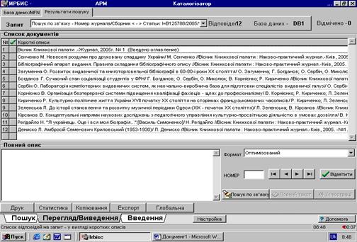 Мал. 1 Формується ЕБД систематичної картотеки статей за участю провідних спеціалістів галузевих відділів. Щорічно постатейно розписується 250–260 назв періодичних видань, з них відділом обслуговування користувачів технічними документами – 40 назв, відділом обслуговування користувачів документами сільськогосподарської тематики – 13, відділом мистецтв – 17, сектором акумуляції та створення інформаційних ресурсів – 180 назв. Перехід на ІРБІС дає можливість підвищити оперативність та якість обробки первинної інформації, збільшити кількість статей які підлягають розпису (за винятком таких, які носять тимчасовий характер, або реклами). Якщо на початку запровадження програми ІРБІС щорічно розписувалося понад 13.0 тис. статей, то з набуттям навиків роботи та кваліфікації бібліотечних працівників спостерігається динаміка їх зростання (Див додаток №5). На кінець 2006 року в ній нараховувалось 232.0 тис. БЗ. Моніторинг звернень читачів за довідково – бібліографічною інформацією засвідчив, що більшість користувачів звертається до ЕКС. Вона забезпечує більш швидкий пошук інформації за елементами БЗ, ключовими словами та предметними рубриками. Одним із специфічних об’єктів каталогізації є опис електронних ресурсів, яких у РДОБ близько 150. Це в основному додатки до журналів, які надходять у відділ технічної літератури на СD-ROM. У базовому форматі UNIMARC системи АБІС ІРБІС для опису електронних ресурсів введено ряд полів, які призначені для опису їх специфічних характеристик. Зокрема всі поля заповнюються за даними із супровідної етикетки електронного ресурсу у відповідності до вимог стандарту «Библиографическая запись. Библиографичесмкое описание электронных ресурсов» 7.82–2001. Обов’язковим є загальне визначення матеріалу (у квадратних дужках наводиться визначення [електронний ресурс]), основні характеристики в області виду, розміру та обсягу ресурсу, дані про фізичний носій, системні вимоги, які включають дані про технічні пристрої, мова програмування, операційні системи та інші специфічні характеристики. Зведений систематичний краєзнавчий кататог (ЗвСКК) – основна ланка краєзнавчого довідково-бібліографічного апарату. Він містить вичерпну інформацію про краєзнавчі документи, які є у фондах бібліотек регіону що формують каталог. У БЗ робиться відмітка (сигл бібліотеки) про місце знаходження документа. У формуванні ЗвСКК беруть участь: Рівненська державна обласна бібліотека, центральні районні, міські бібліотеки, обласний краєзнавчий музей. 1.01.2007 року ЗвСКК містив 13.5 тис. БЗ документів, які мають довідкові анотації, що розкривають зміст документа. Подаються також предметні, географічні рубрики, персоналії, хронологічні підрубрики тощо. В 2004 році в РДОБ створено нову модель корпоративної каталогізації. В об’єднанні працює 22 бібліотеки різного рівня та різних систем і відомств регіону. Головні завдання, корпоративного об’єднання: · створення єдиного регіонального інформаційного простору · впровадження системи організаційної, технічної і технологічної взаємодії бібліотек-учасниць; створення інформаційної мережі бібліотек регіону; · формування кожною бібліотекою – учасницею локальних електронних каталогів на базі АБІС «ІРБІС»; · корпоративна обробка періодичних видань, що забезпечить уникнути дублювання процесів робо