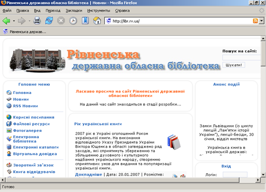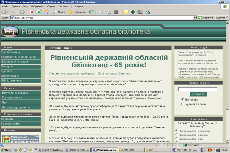 Регіональний інформаційний Портал «Рівненщина» забезпечує доступ до регіональних інформаційних ресурсів, швидкий пошук представленої у мережі Регіональної інформації, що сприяє вдосконаленню громадського суспільства, а також залучення громадськості до участі в демократичних процесах. Портал став однією із складових різноманітних послуг, які надають публічні бібліотеки, включаючи організацію пошукових запитів через електронну пошту. Портал відіграє важливу роль засобів взаємодії з місцевими органами влади, забезпечує доступ до інформації місцевих адміністрацій, а також загальнодержавного рівня, в таких галузях, як охорона здоров’я, освіта, соціальне забезпечення, система пільг та субсидій, оподаткування, працевлаштування і право. Регіональний інформаційний корпоративний портал створив рівні можливості для регіональних органів влади, недержавних організацій, закладів культури та освіти, бізнесових структур у презентуванні себе перед місцевими, національними та міжнародними спільнотами. Проте, складна архітектура Порталу не дозволяє користувачеві оперативно орієнтуватися в пошукових можливостях ресурсу і здійснювати пошук. Відсутній взаємозв'язок між його розділами, а це означає, що читач під час пошуку конкретної інформації змушений відкривати певну рубрику в кожному із розділів порталу «Ресурси», «Тематичний розділ,» «Фото галерея.» Здійснювати пошук за ключовими фразами представленими в документі. Некоректною є робота по наповненню контенту розділу «Консультації.» Не створено архіву в розділі «Новини,» що погіршує пошук інформації. Веб–сайт РДОБ як складова інформаційних ресурсівВажливим завданням бібліотек є надання користувачам книгозбірні та віддаленим користувачам доступу до власних первинних та вторинних інформаційних ресурсів, оскільки в багатьох бібліотеках містяться унікальні наукові та краєзнавчі фонди, оцифрування та представлення яких у мережі Інтернет забезпечить можливість широкого їх використання. Для бібліотеки є важливим розкриття власних інформаційних ресурсів Інтернет аудиторії користувачів «Бібліотечний веб-сайт – це важливий елемент іміджу реальної установи з високим рівнем комфортності та інформаційних можливостей в електронному (віртуальному) світі. Для успіху бібліотечного сайту важливим є його змістовне наповнення (content), яке охоплює різні види інформації: бібліографічну, фактографічну, повнотекстову. Крім того однією з характеристик сайту є актуалізація та редагування усіх відомостей, періодичність оновлення матеріалів.» (9) При розробці сайту особливий акцент робиться на забезпечення продуманої комунікації і зв’язку між підрозділами. Досвід розробки зарубіжних бібліотечних сервісів в ІНТЕРНЕТІ доводить, що бібліографічна продукція у вигляді різноманітних баз даних (БД) і електронних каталогів (ЕК), які мають on-line або off-line доступ, є найбільш цікавою та корисною для читачів. Важливою для пошуку інформації в БД та електронних каталогів(ЕК) є розробка системи допомоги, яка дозволить користувачеві самостійно розібратися в особливостях кожної з баз даних і скористатися всіма можливостями інформаційного пошуку в них. Сайти більшості бібліотек об’єднують як статистичну так і динамічну інформацію. До статистичної інформації можна віднести інформацію пр