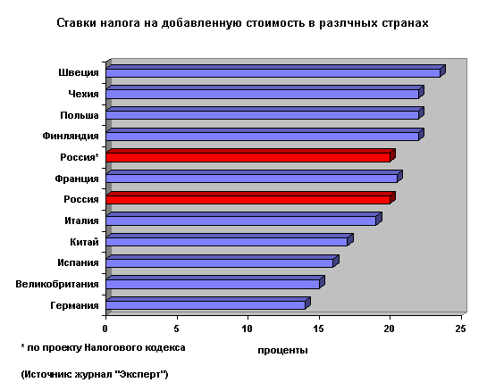 Ставка налога на добавленную стоимость с момента введения в начале 1992 года и по настоящее время неоднократно претерпевала изменения. Первоначально налог был установлен в размере 28%. Однако в условиях неконкурентной среды, отсутствия на рынке необходимой товарной массы, недостаточно продуманной либерализации цен, начало которой по времени совпало с введением НДС (начало 1992 года), развивающейся инфляции ставка оказалась чрезмерно высокой. В настоящее время размер законодательно установленных и применяемых в России ставок налога на добавленную стоимость мало отличаются от ставок этого налога, установленных в европейских странах и Китае (см. рис. 18): Рисунок 18. Ставки НДС в различных странах.