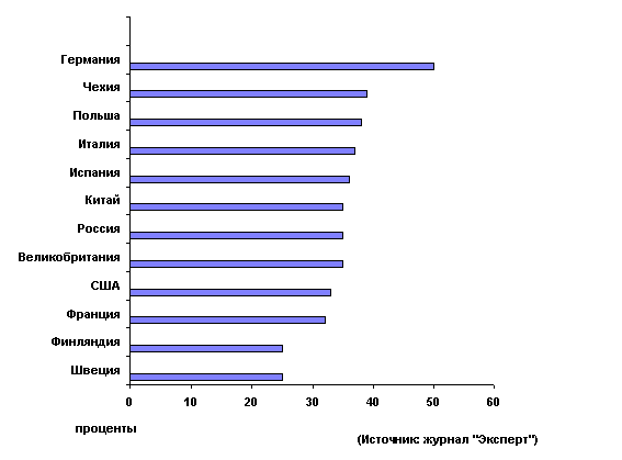 Прибыль от реализации продукции (работ, услуг) определяется как разница между выручкой без налога на добавленную стоимость (НДС) и акцизов и затратами предприятия на производство и реализацию, включаемыми в себестоимость продукции. Перечень таких затрат установлен Положением о составе затрат по производству и реализации продукции (работ, услуг), включаемых в себестоимость продукции (работ, услуг), и о порядке формирования финансовых результатов, учитываемых при налогообложении прибыли. Данное Положение утверждено постановлением Правительства Российской Федерации от 5 августа 1992 года с последующими изменениями и дополнениями. Ставка налога на прибыль в последние годы претерпевала существенные изменения. В 1993 году она была единой - 32%. В 1994 году ставка и механизм взимания налога подверглись изменениям. Законодательно было установлено, что 13% прибыли предприятия поступает в федеральный бюджет. Региональные власти могут устанавливать налог в пределах 25%. В случае отсутствия со стороны региональных властей соответствующего решения налог на прибыль в региональный бюджет должен был взиматься по ставке 22%. То есть, произошло повышение налога на прибыль для предприятий с 32% в 1993 году до 35 - 38% в 1994 году. В 1995 году были произведены новые изменения. Возможность законодательных органов субъектов Российской Федерации устанавливать налог на прибыль была ограничена ставкой 22%. В настоящее время фактически во всех регионах России общая ставка налога на прибыль для предприятий составляет 35% (13% - в федеральный бюджет, 22% - в бюджет субъекта федерации). Основная (установленная для предприятий) российская ставка налога на прибыль (35%) вполне соответствует уровню других государств (см. рис. 19). Рисунок 19. Ставки налога на прибыль в различных странах.