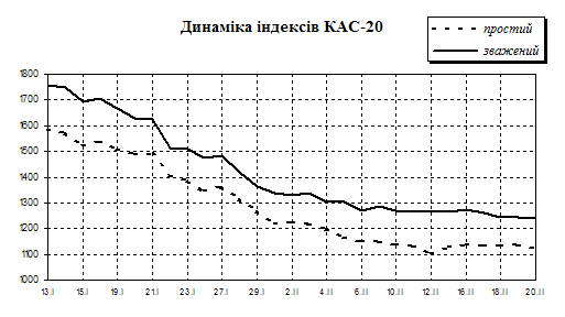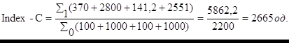 де 0 - сума в базисному періоді; 1 - сума в поточному періоді; Zcomp - сума значень індексів, що входять в комплекс: Zcomp = PROV-50 + KAC-20(w) + index-sgu + WOOD-15 В основу розрахунку індексу покладено зміну значень індексів і, відповідно, зміна капіталізації компаній, які ввійшли у вибірку індексів, тобто стандартна методика капіталізаційних індексів не порушена. Сума значень індексів вибірки в базисному періоді розраховується виходячи з базових значень відповідних індексів: PROV-50 -100 одиниць; КАС-20(w) -1000 одиниць; INDEX-SGU- 100 одиниць; WOOD-15 - 1000 одиниць, таким чином 0(Zcomp)= 2200 одиниць. Сума значень індексів вибірки в поточному періоді розраховується виходячи з даних аналітичних розрахунків значень індексів, які входять в комплекс на поточну дату. Наприклад: розрахуємо значення Іndex-С на 12.03.2000 р. На 12.03.2000 р.: PROV-50 = 370 одиниць; КАС-20(w) = 2800 одиниць; INDEX-SGU = 141,2 одиниць; WOOD-15 = 2551 одиниця.