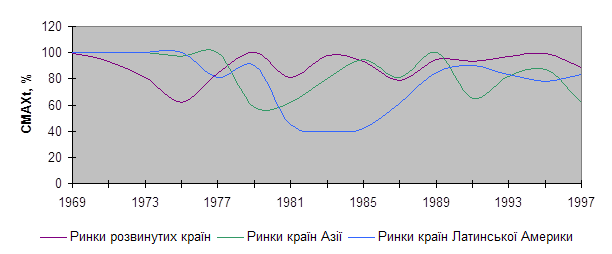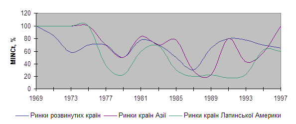 Примітки: 1. Під тривалістю кризи слід розуміти кількість місяців, за які індекс упав до найнижчої точки, а потім піднявся до попереднього піка, тобто суму двох відповідних колонок; 2. “НС” означає “не спостерігається”; 3. Показник “річний дохід” відображає дохід, одержаний завдяки руху фондових індексів. Додаток № 16 [c.56]Відношення мінімального рівня індексів за трирічний період до моменту часу t до рівня індексів на момент часу t у 1970-1997 роках на фондових ринках світу.[49]