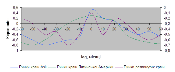 Додаток № 17 [c. 56,57] Кореляція між MINCt i CMAXt+lag у 1970-1997 роках на фондових ринках світу.[50]