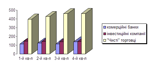 Обіг цінних паперів в Україні забезпечують торговці цінними паперами, представлені суб’єктами підприємницької діяльності, для яких цей вид діяльності є виключним (вони складають близько 65,4%), комерційними банками (16,7%) та інвестиційними компаніями (17,9%). На початку 2000 року в Україні діяв 881 торговець цінними паперами. Протягом 1999 року було видано 167 дозволів на здійснення діяльності щодо випуску та обігу цінних паперів та одночасно анульовано 160 дозволів. Протягом 1999 року спостерігалась тенденція щодо диференціації торговців цінними паперами, а саме поступово визначається стійка група структур, які щоквартально здійснюють обсяги операцій, що перевищують 10 млн. грн., з одночасним збільшенням кількості тих торговців, які взагалі не здійснювали діяльності. Досить значною є група “дрібних” торговців, тобто тих, які виконують щоквартально угод на суму, що не перевищує 100 тис. грн. Більше половини торговців, які здійснювали діяльність протягом 1999 року, відноситься до “середньої групи” – обсяг укладених ними угод складає від 100 тис. до 1 млн. грн.