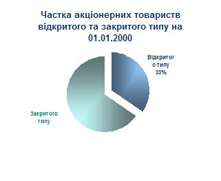 На кінець 1999 року в Україні нараховувалось близько 35580 акціонерних товариств, з яких майже 33% - відкриті акціонерні товариства.