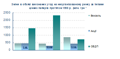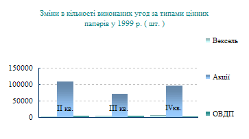 У 1999 році за обсягами виконаних угод перше місце посідали облігації внутрішньої державної позики та векселі. За кількістю виконаних угод перше місце посідали акції.