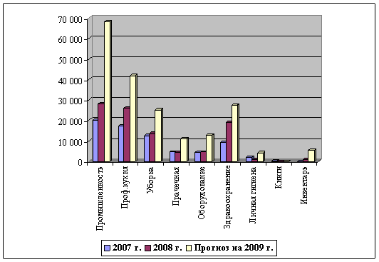 Рисунок 3 – Динамика продаж групп продуктов в 2007, 2008, прогноз на 2009 гг. По приведенным данным видно, что значительный скачок по продажам сделала продукция для здравоохранения это связано с тем, что в начале 2008 г. начал работу менеджер по работе с предприятиями здравоохранения. Хороший рост показали продукты для промышленного применения и для профессиональных кухонь. Развитие промышленности связано с тем, что в 2008 г. начата активная работа с молочными фермами. Продажи книг значительно снизились, поскольку продажи 2007 г. были обеспечены участием в большом количестве выставок, но 2008 г. не принес такого же результата, и стало очевидно, что пробный проект по продаже книг по уборке провалился и, российский потребитель еще не готов к такого рода продуктам (в Финляндии книги – руководство по уборке и другим областям, связанным с чистотой продаются успешно). Цели по продажам на 2009 г. определены и оглашены на общем собрании всем сотрудникам, кроме того, разработаны и установлены цели по продажам для каждого менеджера, что будет проанализировано позже. Определены основные пути достижения поставленных целей. Продажи продукции для промышленности предполагается увеличивать за счет привлечения дополнительного сотрудника на этом направлении, а также более активной работы и продвижения продукции Farmos крупным пивоваренным компаниям таким как «Балтика». Направления уборка и прачечная предполагается развивать путем активной работы с гостиничными комплексами как уже действующими, так и завоевание только готовящейся к открытию сети «Sokos». За счет входа в гостиницы предполагается увеличить продажи также средств для профессиональной кухни и инвентаря. В сегмент здравоохранение продажи должны быть увеличены за счет продажи новых продуктов – аналогов содержащим этиловый спирт дезинфектантов, продажа которых было ограничена законом об обороте этилового спирта. 2.2 Анализ внешней и внутренней среды ООО «Фармос»Анализ внешней средыК факторам внешней среды, которые оказывают наибольшее влияние на деятельность компании можно отнести следующие: Факторы прямого воздействия: · материнская компания (направления политики материнской компании определены в пункте миссия и стратегическое видение); · поставщики; · покупатели; · конкуренты; · таможенное и налоговое законодательство. Факторы косвенного воздействия: · развитие и рост отраслей потребителей продукции Farmos, таких как пищевая, с\х, туризм и туристическая инфраструктура, развлекательная инфраструктура, медицина; · улучшение отношения к чистоте на российских предприятиях и восприятие чистоты и гигиены как важного факторов конкурентоспособности и части имиджа компании. Факторы косвенного воздействия оказывают благоприятное влияние на деятельность организации и расширяют потенциал рынка профессиональных моющих средств и делают данную отрасль привлекательной. Действие факторов прямого воздействия не так однозначно, рассмотрим каждый из них более подробно. Основным поставщиком товара и сырья является материнская компания Farmos OY – это дает следующие преимущества: · лояльность ценовой политики; · сокращенный срок размещения и обработки заказов; · производственный план Farmos OY составляется с учетом прогнозов продаж в России во избежание перебоев поставки продукции; · возможность раз
