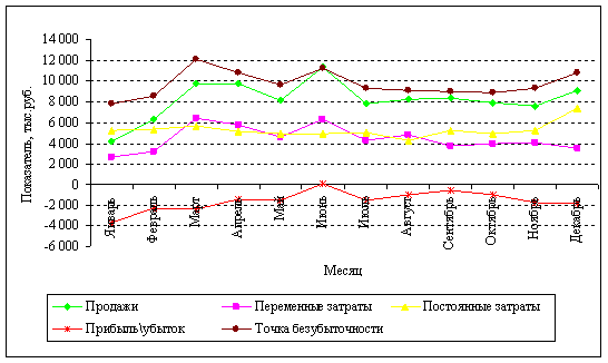 Проанализировав таблицу 10 и рисунок 4 видно, что в течение 2008 г. Фармос вышел на безубыточность только в июне, значение же точки безубыточности колеблется от 7,8 до 12 млн. руб. и в среднем за год составляет 10 млн. руб. Видно, что продажи нестабильны, за скачками марта, апреля и июня следуют падения мая и июля, провальные отгрузки в сентябре и октябре. Сумма общих затрат стабильна, скачки наблюдались в марте, июне и декабре. Резкое повышение затрат марта и июня связаны с активной закупкой товара в Финляндии в связи с недопоставками в предыдущих месяцах. Повышение затрат в декабре вызвано большими рекламными расходами, а именно участие в выставке, изготовление выставочного оборудования и рекламных материалов; а также большой суммой затрат на услуги сторонних организаций, а именно привлечение аудиторов для проверки управленческого и бухгалтерского учета.