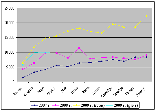 Рисунок 4 – Показатели деятельности ООО «Фармос» за 2008 г. Система планирования затрат и составление бюджетов в организации основывается на прогнозах продаж. Исходя из показателей предполагаемой выручки, определяются бюджеты подразделений, в рамках которых они могут нести затраты. Поскольку Фармос не достигает запланированных объемов продаж, а затраты пропорционально не уменьшаются фирма закономерно получает убыток. Проанализировав показатели деятельности ООО «Фармос» можно сделать вывод о том, что основной проблемой и причиной убыточности предприятия является низкие обороты деятельности, которые не позволяют организации выйти на безубыточность. Таблица 11 – Продажи ООО «Фармос» 2007–2009 гг.