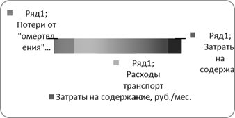 Рисунок 3 – Вклад транспортно-заготовительных расходов на соответствующие ресурсы в суммарное значение По результатам расчётов (и исходя из диаграммы) можно сделать вывод, что большую часть в суммарных транспортно-заготовительных расходах ОАО «Дом» занимают расходы по доставке, погрузке и разгрузке покупных изделий и полуфабрикатов. По диаграмме можно заметить также, что графики имеют одинаковую тенденцию в развитии, то есть идут почти параллельно друг другу. Это связано с тем, что транспортно-заготовительные расходы на соответствующие ресурсы в большей степени зависят от размеров партии поставки, а, следовательно, от объёма выпуска холодильников в течение месяца. Также из рисунка 3 видно, что максимальные транспортно-заготовительные расходы приходятся на сентябрь, это связано с выпуском продукции. Потери от «омертвления» средств в производственных запасах определяются по следующей формуле: ЗОМ = Рл ∙ ЗПР∙ Д =0,5 ∙Ц ∙ Qп ∙ k∙ Д, руб./мес. (8) где Рл–величина, учитывающая пролеживание материальных ресурсов в течение месяца(часть ресурсов потребляется сразу, часть в середине месяца, часть в конце). Можно принять равной 0,5; Зпр– величина месячного производственного запаса, шт.; K –количество поставок; Ц– цена материального ресурса, руб./шт; Д – стоимость денежных ресурсов (её можно принять с учетом средней рентабельности производства или изделий). Например, если средняя рентабельность производства холодильников составляет 15%, то данный коэффициент «Д» можно принять равным 0,15. Результаты расчётов потерь от «омертвления» сведены в таблицу 3. Таблица 3 - Расчет потерь от "омертвления" средств в производственных запасах.