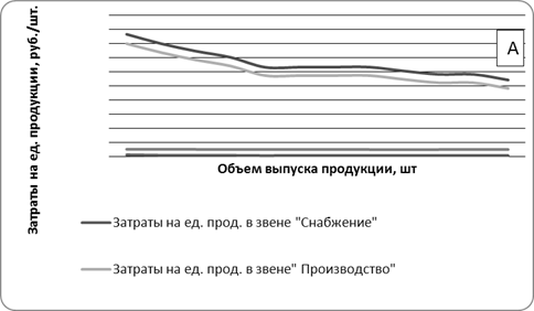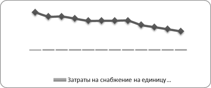 Рисунок 7 - Зависимость затрат на единицу от объема выпуска продукции. На рисунке 5 отображена структура затрат в звене «Снабжение», то есть доли расходов на транспорт, содержание затрат и потери от «омертвления» капитала в общей сумме затрат на снабжение. В результате можно заметить, что потери от омертвления капитала составляют примерно 38% от общей сумы и играют наибольшую роль(самую меньшую долю занимают транспортно-заготовительные расходы −26%). Таким образом, руководству ОАО «ДОМ» следует обратить особое внимание на минимизацию и оптимизацию именно затрат на содержание запасов при снижении себестоимости продукции. Рисунки 6 и 7 позволяют выявить общую зависимость суммарных затрат на снабжение и на единицу продукции от объёма выпуска продукции в месяц. Можно сделать вывод, что суммарные затраты растут с ростом количества выпускаемой продукции, причём рост этот интенсивнее при небольших партиях выпуска. Затраты на единицу продукции, наоборот, снижаются с ростом объёма выпуска, то есть они минимальны при максимальном количестве выпускаемой продукции (сентябрь). Таким образом, в данном разделе мы произвели расчёт суммарных затрат на снабжение на ОАО «ДОМ» и затрат на единицу выпускаемой продукции. Получили следующие результаты: следующие результаты: Затраты на содержание запасов максимальны в сентябре, за счёт использования в этих месяцах дополнительных складских площадей. Проанализировав структуру транспортно-заготовительных расходов, заметили, что большую часть занимают расходы по доставке, погрузке и разгрузке покупных изделий и полуфабрикатов. Также были посчитаны потери от «омертвления» капитала, в результате получили, что они максимальны в сентябре (из-за увеличения в эти месяцы величины производственных запасов), и минимальны ноябре. Общие затраты максимальны в сентябре и минимальны в ноябре (наибольший и наименьший выпуск продукции соответственно), а затраты на единицу продукции наоборот. Это связано с тем, что суммарные затраты растут с увеличением объёма выпуска продукции, но при этом постоянные затраты, связанные с производством и реализацией, остаются неизменными и, следовательно, затраты на единицу продукции снижаются. Таким образом, в данном пункте мы рассчитали затраты в звене «Снабжение». 2.2 Оценка затрат в логическом звене «Производство» В данном пункте используя данные, указанные в приложении, определим затраты в сфере производства, и отразим результаты расчётов в таблице 9. Таблица 5 – Затраты в звене «Производство».