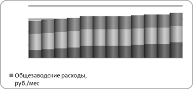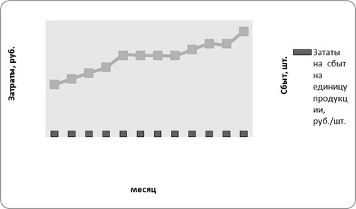 Рисунок 9 – Зависимость затрат на единицу продукции в звене «Производство» от объема выпуска продукции. На рисунке 8 отображены суммарные затраты на производство продукции с разбивкой по видам затрат, они максимальны в сентябре, в котором и производится наибольшее количество продукции. Это связано с тем, что затраты на заработную плату являются переменными, а значит зависят от объёма выпуска. Цеховые же и общезаводские расходы - постоянны, так как их необходимо осуществлять при любом количестве выпускаемой продукции. Следовательно рост суммарных затрат в данном случае связан только с ростом затрат на зарплату производственных рабочих. Затраты на единицу максимальны в ноябре (постоянные затраты большие, а выпуск продукции минимален) и минимальны в сентябре, что наглядно подтверждено на рисунке 9. 2.3 Определение затрат в логическом звене «Сбыт» Для проведения расчетов в данном разделе необходимо принять во внимание следующую информацию: - Для реализации продукции на предприятии имеется соответствующая инфраструктура – склад готовой продукции и система распределения продукции (сбытовая сеть). - Склад готовой продукции и сбытовая сеть имеют соответствующую пропускную способность: склад готовой продукции способен разместить Q'с, ед.; распределительная (сбытовая) сеть в состоянии пропустить через себя -Q'сеть, ед./поставку; в данном случае пропускная способность склада и сети равны (Q'с =Q'сеть). - Затраты на содержание склада составляютЗ'с, руб./мес. - Готовая продукция отправляется потребителям железнодорожным транспортом равными частями 10 раз в месяц (k') при любой месячной программе выпуска. Суммарные затраты на сбыт готовой продукции в месяц определяются как: З'сбыт = З'сод + З'тзр + З'ом, руб./мес. (9) В случае поставки готовой продукции из производственных подразделений в объёмах, превышающих размеры склада, затраты на хранение (содержание) готовой продукции определяются как: З'сод = З'скл + З'доп, руб./мес., (10) гдеЗ'скл - затраты на содержание готовой продукции на складе, руб. (исходные данные, таблица П5) З'доп - затраты на содержание готовой продукции, хранящихся вне пределов склада, руб./мес.