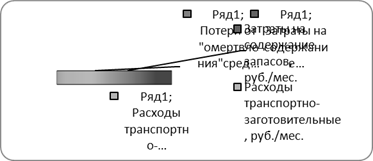Рисунок 4− Распределение суммарных потерь от омертвления. В данной таблице мы рассчитали потери от «омертвления» средств в производственных запасах. В результате получили, что потери от «омертвления» капитала максимальны в сентябре из-за увеличения в этот месяц объёма выпуска холодильников, а значит и величины производственных запасов, и минимальны в ноябре (выпуск продукции наименьший и равен 900 единиц). Из рисунка 4 видно, что наибольший вклад в потери от омертвления вносят изделия и полуфабрикаты. Все линии на графике расположены параллельно друг к другу, что говорит о том, что все потери изменяются по одинаковой зависимости от объема выпуска продукции. Далее рассчитаем суммарные затраты на снабжение в месяц. Результаты расчётов сведём в таблицу 4. Таблица 4 - Общие затраты в звене "Снабжение", для сырья и материалов руб./мес.