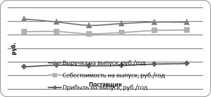 Рисунок 21 −Сравнение основных показателей при оптимальном и прогнозируемом объемах выпуска. В данной таблице мы произвели расчёт полной себестоимости на единицу и на весь выпуск продукции, рассчитали выручку от реализации, прибыль и рентабельность выпуска продукции при оптимальном объёме выпуска и сравнили их с полученными при прогнозируемых значениях спроса (пессимистический и оптимистический). При рассмотрении основных затрат при пессимистическом и оптимистическом объеме выпуска видно, что затраты на производство уменьшаются при оптимистическом объеме выпуска, по сравнению с пессимистическим вариантом. Это связано с увеличением объема производства. На рисунке 21 видно, что максимальная выручка и прибыль от реализации продукции достигается при оптимистическом объеме выпуска. В то же время, минимальная себестоимость на выпуск всей продукции, достигается при оптимальном объеме выпуска. При организации второй смены у предприятия значительно увеличивается объем выпуска продукции (с 21600шт. до 36000 шт.), что с одной стороны ведет к увеличению затрат, себестоимости продукции, а с другой – к увеличению прибыли. Согласно спросу, требуется 27400 шт. продукции в год, что больше оптимального объема выпуска, и меньше оптимистического. Можно предположить, что рынок уже насыщен. 3.3 Выбор поставщиков Выберем наиболее оптимальный вариант закупки компрессоров. Для этого при определённой ранее оптимальной партии выпуска продукции оценим экономические потери из-за нарушения ритма поставок. Дополнительная информация для проведения расчетов в данном разделе: - Исследования показали, что на предприятии имеются потери из-за недовыпуска продукции, который в основном объясняется неритмичностью поставок компрессоров для холодильников «Ока-8А». - Поставщики компрессоров в рассматриваемом годе приведены в исходных данных (таблица 3). - Анализ рынков компрессоров для холодильников показал, что в будущем году есть возможность заключить договора с новыми поставщиками. Основная особенность поставщиков заключается в том, что предлагая одинаковые по качеству компрессоры, свою цену они назначают в зависимости от точности поставки (чем точнее соблюдение сроков поставки, тем выше цена). Поэтому к выбору поставщика необходимо подойти с позиций – что выгоднее, закупать более дорогие компрессоры (что уменьшит прибыль) и сократить простои или закупать дешевые компрессоры у поставщиков, имеющих самые большие срывы поставок. Таблица 13 –Экономическая оценка возможных вариантов закупки компрессоров у различных поставщиков