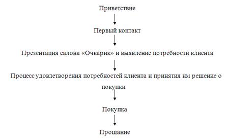 В отчетном году ОАО "Московское объединение "Оптика" провело ряд последовательных мероприятий по дальнейшему совершенствованию и модернизации программных продуктов в целях автоматизации работы салонов, склада и аппарата управления. Внедрены новые модули, усовершенствованы существующие, ведутся новые разработки в данном направлении, что позволит оптимизировать бизнес-процессы Общества, упрочнить положение в условиях жесткой конкурентной борьбы и продолжить развитие торгово-розничной сети в заданном высокотехнологичном векторе. На основании оперативных статистических данных руководством Общества осуществляется мониторинг градационной структуры выручки, остатков товарно-материальных ценностей салонов оптики, провидится комплексный анализ деятельности Общества по направлениям для принятия взвешенных управленческих решений. Организационная структура ОАО «Московское объединение «Оптика» оптимально отражает разделение управленческих функций и полномочий, обеспечивает высокую эффективность в решении задач, направленных на повышение конкурентоспособности Общества, а также способствует его дальнейшей финансовой стабилизации. Работа с персоналом в отчетном году была ориентирована на обеспечение оптимального состава квалифицированных специалистов на различных уровнях организационной структуры. По состоянию на 1 января 2008 года общая численность сотрудников ОАО "Московское объединение "Оптика" составила 645 человек, из которых 445 человек работают в салонах. Понимая, что высокий профессиональный уровень специалистов является одним из основных факторов успеха, Общество уделяет особое внимание повышению профессионального уровня персонала. Постоянно проводится обучение специалистов сотрудниками торгово-технологической службы и отделом по работе с персоналом и организация участия в специализированных семинарах и программах подготовки. В 2007 году большое внимание уделялось и будет уделяться социальной поддержке сотрудников, так на оказание материальной помощи сотрудникам Общества было выделено 210 тыс. рублей, 14 детей сотрудников были направлены в детские санаторно-оздоровительные лагеря за счет средств Общества. 2.4 Содержание коммерческой деятельности предприятия - Технология продаж