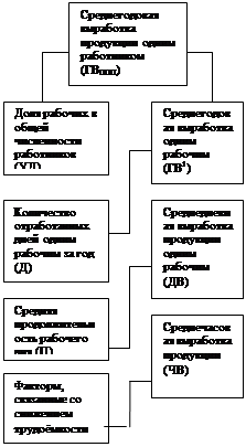 направления: Источники информации для анализа: План по труду, ф №1-Т “Отчёт по труду”, ф №5-3 “Отчёт о затратах на производство и реализацию продукции (работ, услуг) предприятия (организации), статистическая отчётность отдела кадров по движению рабочих и др.” Для оценки уровня производительности труда применяется система обобщающих, частных и вспомогательных показателей. К обобщающим показателям относятся среднегодовая, среднедневная и среднечасовая выработка продукции одним рабочим, а также среднегодовая выработка продукции на одного работающего в стоимостном выражении. Частные показатели – это затраты времени на производство единицы продукции определенного вида (трудоемкость продукции) или выпуск продукции определенного вида в натуральном выражении за один человеко-день или человеко-час. Вспомогательные показатели характеризуют затраты времени на выполнение единицы определенного вида работ или объем выполненных работ за единицу времени. Наиболее обобщающим показателем производительности труда является среднегодовая выработка продукции одним работающим. Величина его зависит не только от выработки рабочих, но и от удельного веса последних в общей численности промышленно-производственного персонала, а также от количества отработанных ими дней и продолжительности рабочего дня