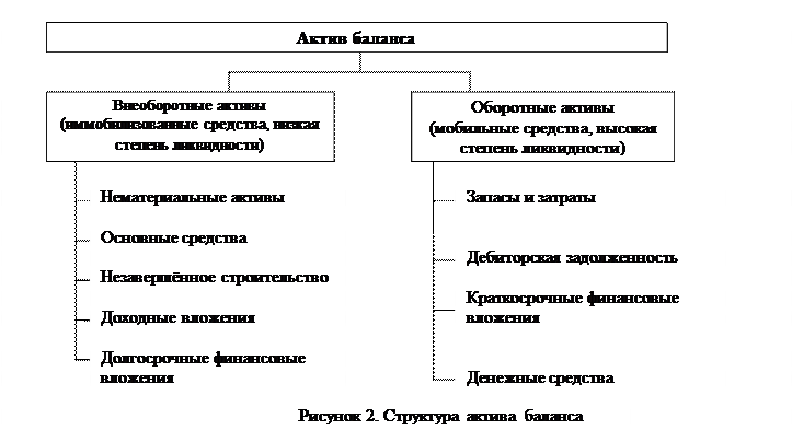 Для аналитических исследований и качественной оценки динамики финансово-экономического состояния предприятия рекомендуется объединять статьи баланса в отдельные специфические группы (табл.1). Цель - создание агрегированного баланса, который используется для определения важных характеристик финансового состояния предприятия и расчета ряда основных финансовых коэффициентов. 2.2 Анализ динамики и структуры актива баланса.Под активами обычно понимают имущество (ресурсы предприятия), в которое инвестированы деньги. Статьи актива располагают в зависимости от степени ликвидности (подвижности) имущества, т.е. от того насколько быстро данный вид актива может приобрести денежную форму. Разделы актива баланса также строятся в порядке возрастания ликвидности (рисунок 2). 1. Внеоборотные активы (иммобилизованные средства): · нематериальные активы (патенты, авторские права, лицензии, торговые марки и другие ценные, но не овеществленные активы, контролируемые предприятием); · основные средства (имущество, здания, оборудование, земля, т.е. материальные активы с относительно долгим сроком полезной службы); · капиталовложения (незавершённое строительство, долгосрочные финансовые вложения и др.). 2. Оборотные активы (мобильные средства): · запасы товарно-материальных ценностей и затраты (совокупность статей, которые характеризуют имущество): а) хранящиеся для реализации; б) находящиеся в процессе производства для реализации; в) постоянно расходующиеся на производство продукции); · дебиторская задолженность; · краткосрочные финансовые вложения (капиталовложения в ценные бумаги, инвестиции и др.); · денежные средства. Оборотные активы более ликвидны, чем внеоборотные. Это обусловлено тем, что внеоборотные активы представляют ту часть имущества предприятия, которая не предназначена для продажи, а постоянно используется для производства, хранения и транспортировки продукции. Оборотные активы участвуют в постоянном цикле превращения их в денежные средства. В свою очередь их также можно разделить по степени ликвидности: наиболее ликвидные оборотные активы - денежные средства, ценные бумаги, далее по степени убывающей ликвидности следует дебиторская задолженность, запасы и затраты.
