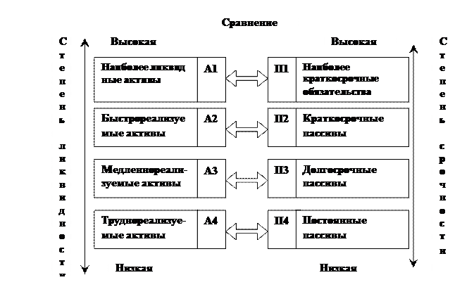 Рисунок 4. Группировка статей актива и пассива для анализа ликвидности баланса При определении ликвидности баланса группы актива и пассива сопоставляются между собой (рисунок 4). По показателям бухгалтерского баланса соотношения между активом и пассивом могут быть представлены в следующем виде. Условия абсолютной ликвидности баланса: А1 > П1 А2 > П2 А3 > П3 А4 < П4 Необходимым условием абсолютной ликвидности баланса является выполнение следующих условий: А1 > П1 А2 > П2 А3 > П3. Выполнение неравенства А4 < П4 носит так называемый балансирующий характер : его выполнение свидетельствует о наличии у предприятия собственных оборотных средств (Ес= Ис-F). Если любое из неравенств имеет знак, противоположный зафиксированному в оптимальном варианте, то ликвидность баланса отличается от абсолютной. Сопоставление А1 – П1 и А2 – П2 позволяет выявить текущую ликвидность предприятия, что свидетельствует о платежеспособности (неплатежеспособности) в ближайшее время. Сравнение А3 –П3 отражает перспективную ликвидность. На её основе прогнозируется долгосрочная ориентировочная платежеспособность. Анализ ликвидности баланса проводится с помощью аналитической таблицы 9, по данным которой делают вывод , что баланс предприятия соответствует (или не соответствует) всем критериям абсолютной ликвидности. Предприятие полностью на начало и конец года покрывает все свои обязательства по любому виду пассивов. При изучении баланса следует обратить внимание на такой показатель как чистый оборотный капитал, или чистые оборотные средства. Изменение уровня ликвидности определяется по изменению абсолютного показателя чистого оборотного капитала. Он составляет величину, оставшуюся после погашения всех краткосрочных обязательств. Анализ ликвидности баланса предприятия Таблица 9.
