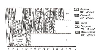 При построении графика работы котлов следует учесть, что конец тепловой обработки блюд должен совпадать с началом их реализации; при изготовлении бульонов необходимо зарезервировать время на варку супов на этих бульонах, а при варке продуктов для холодных блюд – время на приготовление холодных блюд. После построения графика работы котлов определяется коэффициент их использования по формуле з = где з – коэффициент использования котла; tк – время полного оборота котла, ч; Т – время работы цеха, ч. Коэффициент использования котлов должен быть не менее 0,4-0,5; в противном случае котел заменяется функциональными емкостями (приложение 34). График работы пищеварочных котлов показан на рис. 2.1. Пример. Для общедоступной столовой рассчитать вместимость котлов, предназначенных для приготовления концентрированного мясо-костного бульона, 790 порций борща, 8 кг картофеля отварного и 10 кг каши гречневой рассыпчатой. Норму закладки продуктов принять по Сборнику рецептур блюд (1981 г.). Чтобы найти необходимое количество концентрированного бульона, следует число порций борща умножить на объем одной порции (дмі) и разделить на кратность разведения, т.е. 790Ч0,25/3,4 = 58,1 дмі. Расчеты представлены в табл. 2.56-2.58. Таблица 2.56 Расчет вместимости котлов для варки мясо-костного бульона