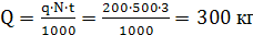 где Q – количество продукта данного вида, подлежащее хранению в складском помещении, кг; q – норма продуктов на одного человека в день, г; N – количество потребителей, пользующихся услугами проектируемого предприятия; t – срок хранения продуктов в днях. Пример. Определить количество мясопродуктов, подлежащих хранению в складском помещении столовой подмосковного дома отдыха на 500 человек. По приложению 16 норма мясопродуктов на одного человека в день – 200 г. Срок хранения мяса в охлажденном помещении – 3 дня.