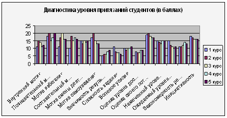 Анализ данных таблицы 2.1 позволяет сделать вывод о том, что в мотивационной структуре студентов ведущее место занимают мотивы, связанные с мотивами престижа. Эти мотивы для студентов старших курсов не являются реально действующими и побудительными, так как они не связаны с близкими профессиональными целями. Но осознание этих целей нуждается в подкреплении процессуальной мотивацией, которая сопровождается эмоциональным отношением студентов к процессу профессиональной подготовки. В свою очередь, учебно-познавательные мотивы являются доминирующими лишь у студентов на третьем курсе обучения в вузе. Подводя итоги, необходимо отметить, что результаты изучения мотивационных аспектов профессиональной подготовки являются основой для дальнейшего совершенствования процесса обучения и саморазвития личности. Результаты исследований могут быть использованы для выявления категорий студентов в зависимости от направленности мотивации (с доминированием внешней или внутренней мотивации); для исследования эффективности процесса профессиональной подготовки с точки зрения поиска резервов и направлений ее совершенствования. По результатам тестирования для определения уровня притязаний личности по опроснику В. Гербачевского мы определили мотивационную структуру испытуемых. В этой структуре различают 15 компонентов. По каждому из этих компонентов подсчитали сумму баллов с помощью ключа и правил перевода ответов испытуемых в баллы (см. рисунок 2.1).