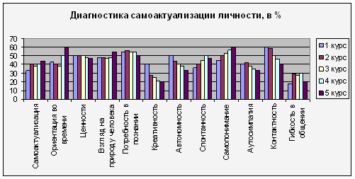 Рис. 2.2 Самоактуализация личности студентов по методике А.В. Лазукина в адаптации Н.Ф. Калина (САМОАЛ) студент психологический профессиональный качество Проанализировав полученные результаты, можно сделать следующие выводы: 1) стремление к самоактуализации на первом и втором курсах в наибольшей степени выражено следующими пунктами теста: контактность (60% на первом курсе, 59% – на втором), потребность в познании (55% на первом курсе, 56% – на втором), автономность и ценности (по 50% на первом курсе и 51% – на втором). Высокий балл по шкале «ценности» свидетельствует, что человек разделяет ценности самоактуализирующейся личности, к числу которых А. Маслоу относил такие, как истина, добро, красота, целостность, отсутствие раздвоенности, жизненность, уникальность, совершенство, свершения, справедливость, порядок, простота, легкость без усилия, игра, самодостаточность. Предпочтение этих ценностей указывает на стремление к гармоничному бытию и здоровым отношениям с людьми, далекое от желания манипулировать ими в своих интересах. Автономность, по мнению большинства гуманистических психологов, является главным критерием психического здоровья личности, ее целостности и полноты. Шкала контактности измеряет общительность личности, ее способность к установлению прочных и доброжелательных отношений с окружающими. Высокая потребность в познании характерна для самоактуализирующейся личности, всегда открытой новым впечатлениям. Эта шкала описывает способность к бытийному познанию – бескорыстную жажду нового, интерес к объектам, не связанный прямо с удовлетворением каких-либо потребностей. 2) к выпускным курсам прослеживается динамика повышения количества баллов (и соответственно процентов) по следующим шкалам: «самопонимание» (от 45% на первом курсе до 60% – на пятом), «ориентация во времени» (от 43% на первом курсе до 60% – на пятом); и динамика понижения количества баллов по шкале «аутосимпатия» (40% на первом курсе, 33% – на пятом курсе) и «контактность» (60% на первом курсе, 40% – на пятом курсе). Шкала ориентации во времени показывает, насколько человек живет настоящим, не откладывая свою жизнь «на потом» и не пытаясь найти убежище в прошлом. Высокий результат характерен для лиц, хорошо понимающих экзистенциальную ценность жизни «здесь и теперь», способных наслаждаться актуальным моментом, не сравнивая его с прошлыми радостями и не обесценивая предвкушением грядущих успехов. Низкий результат – это люди, невротически погруженные в прошлые переживания, с завышенным стремлением к достижениям, мнительные и неуверенные в себе. Высокий показатель по шкале «самопонимание» свидетельствует о чувствительности, сензитивности человека к своим желаниям и потребностям. Такие люди свободны от психологической защиты, отделяющей личность от собственной сущности, они не склонны подменять собственные вкусы и оценки внешними социальными стандартами. Низкий балл по шкале самопонимания свойственен людям неуверенным, ориентирующимся на мнение окружающих. Аутосимпатия – естественная основа психического здоровья и цельности личности. Низкие показатели имеют люди невротичные, тревожные, неуверенные в себе. Аутосимпатия вовсе не означает тупого самодовольства или некритичного самовосприятия, это просто хорошо осознаваемая позитивная «Я-концепция», служ