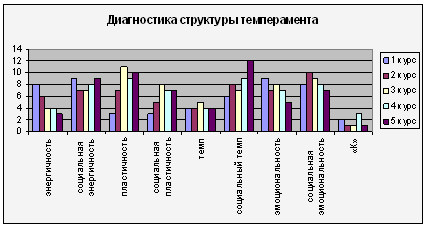 Рис. 2.3 Структура темперамента студента Проанализировав полученные результаты, мы пришли к следующим выводам: 1) по шкале «энергичность» получены средние значения на 1–4 курсах, а это может означать, что студентам этих курсов свойственны избирательность в проявлении активности, могут относительно долго сохранять работоспособность, особенно в тех случаях, когда затрагиваются личные интересы; и низкое значение на пятом курсе, в свою очередь низкие значения означают пассивность, общий жизненный тонус низкий, стремление к напряженной физической и умственной деятельности выражено слабо, предпочитаемые сферы деятельности весьма ограничены. 2) шкала «социальная энергичность»: высокие значения на первом и пятом курсах (для высоких значений характерно потребность в людях, наличие широкого круга общения, инициативность, социальная активность) и средние значения на втором, третьем и четвёртом курсах (средние значения означают избирательность в контактах; легкость в нахождении общего языка с теми, кто хорошо знаком, близок по духу, интересам; общение с малознакомыми людьми требует преодоления напряжения, смущения, неуверенности). 3) по шкале «пластичность» выражена динамика увеличения средних баллов от первого к пятому курсу (от низких значений на первом курсе к высоким значениям на пятом курсе). Низкие значение означают склонность к монотонной работе, боязнь и избегание разнообразных форм поведения, вязкость, консервативные формы деятельности. В свою очередь высокие значения могут являться показателем легкости переключения с одного вида деятельности на другой, быстрого перехода с одних форм мышления на другие в процессе взаимодействия с предметной средой, стремления к разнообразию форм предметной деятельности. 4) Социальная пластичность – содержит вопросы, направленные на выяснение степени легкости или трудности переключения в процессе общения от одного человека к другому, склонности к разнообразию коммуникативных программ. Анализ результатов показал низкие значения на первом курсе (трудность в подборе форм социального взаимодействия, низкий уровень готовности к вступлению в социальные контакты, стремление к поддержанию монотонных контактов), и средние значения на втором, третьем и выпускных курсах (широкий набор коммуникативных программ, автоматическое включение в социальные связи, легкость вступления в социальные контакты, легкость переключения в процессе общения, наличие большого количества коммуникативных заготовок, коммуникативная импульсивность). 5) по шкале «темп» на всех курсах были получены средние результаты, а это означает высокий темп поведения, высокая скорость выполнения операций при осуществлении предметной деятельности, моторно-двигательная быстрота, высокая психическая скорость при выполнении конкретных заданий. 6) Социальный темп – включает вопросы, направленные на выявление скоростных характеристик речедвигательных актов в процессе общения. Средние значения выявлены на первом, втором и третьем курсах, что означает недостаточное развитие речедвигательной системы, речевую медлительность, медленную вербализацию; а высокие значения на выпускных курсах, что может быть показателем речедвигательной быстроты, быстроты говорения, высокой скорости и возможности речедвигательного аппара