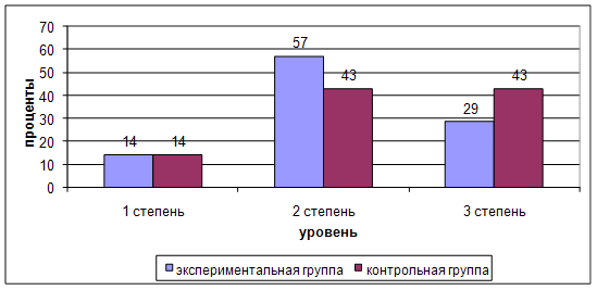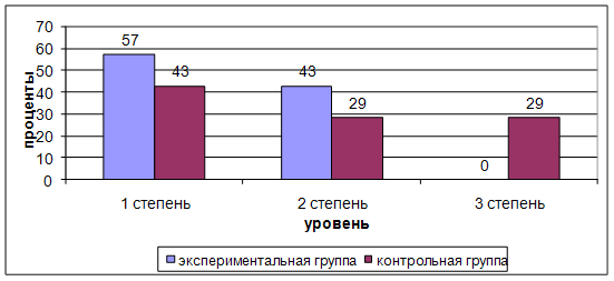 Первая степень выраженности обнаружена у 57% детей экспериментальной и 43% контрольной группы. Вторая степень выраженности – у 43% детей экспериментальной, и 29% контрольной группы. Третья степень выраженности – у 0% детей экспериментальной группы, и 29% – контрольной группы. Было проведено также анкетирование родителей (см. Приложение 3) [17, 2]. Анкета дала возможность узнать у родителей, какая была подготовка ребенка к ДОУ, а также выяснить особенности протекания процесса адаптации с точки зрения родителей. Поэтому в анкете освещаются различные вопросы, например: какой режим дня ребенка дома, особенности темперамента ребенка, каким образом проходила подготовка к детскому саду, как воспринимает малыш детский сад, воспитателей, других детей, как проходит общение и игры их ребенка с другими детьми, с каким настроение он утром идет в группу, а вечером встречает маму. Анкетирование показало, помимо того, что в экспериментальной группе как и в контрольной родители целенаправленно готовили своего ребенка к поступлению в детский сад, предварительно знакомили детей с воспитателями, детьми и т.д., в экспериментальной группе в период адаптации воспитатели занимались с детьми художественной деятельностью, это оказалось более успешным в установлении отношений с детьми и воспитателями. Адаптация проходит легче Таким образом, можно сказать, что процесс адаптации у большинства детей уже заканчивается, за исключением Жени Л. У него адаптация проходит наиболее тяжело, его отличает от других детей равнодушие к игрушкам, и детям, незначительно выражены внешние проявления эмоций, страх при расставании с матерью. При этом он часто болеет (2 раза за этот период), что тоже пагубно отражается на процессе адаптации. В целом дети экспериментальной группы успешно прошли адаптацию. В контрольной группе процесс адаптации проходил достаточно тяжело, и у некоторых детей еще не закончился. Анкетирование помогло разобраться в причинах успешности или не успешности адаптации. Часть родителей, например, мама Наташи А. (экспериментальная группа) посещала занятия и занималась изобразительной деятельностью. В результате чего облегчило ей процесс привыкания. Но затрудняет течение адаптации, у этой девочки различие режимов в детском саду и дома. По этому поводу воспитателями была проведена беседа с родителями девочки. Женя Л. (контрольная группа) более трудно проходит адаптацию, так как часто более и пропускает детский сад. Ребенок был испуган, когда его в первый раз оставили в детском саду. Из-за отрицательных эмоций мальчику не понравилось в детском саду, он со слезами остается в группе. Несмотря на то, что Женю тянет к детям, он не играет с ними, не обращается к воспитателю. У него плохой аппетит и сон. Также анкетирование показало, что у большинства детей происходит дома процесс «откачки маятника». Одни дети, очень подвижные днем в детском саду, затихают. Им необходимо заняться чем-то спокойным: почитать книгу, порисовать, поиграть в успокаивающие игры. Другие дети, наоборот, дома «отрываются». В детском саду сидят в уголочке, стесняются или боятся, а дома им нужно выбросить лишнюю энергию, они обязательно должны быть в центре внимания. Если поведение родителей соответствует нуждам ребенка, то на следующий день ребенок чувствует себя хорошо, если же родители не в
