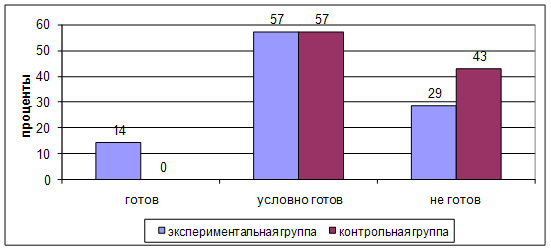 Первая степень выраженности обнаружена у 14% детей и экспериментальной и контрольной групп. Вторая степень выраженности – у 57% детей экспериментальной, и 43% контрольной группы. Третья степень выраженности – у 29% детей экспериментальной группы, и 43% – контрольной группы. Второй этап исследования заключался в определении психолого-педагогических параметров определения готовности поступления ребенка в дошкольное учреждение (см. Приложение 1) [24, 14-17]. Полученные данные представлены на диаграмме (см. Рис.2.) Рис. 2. Оценка готовности детей к ДОУ по психолого-педагогическим параметрам