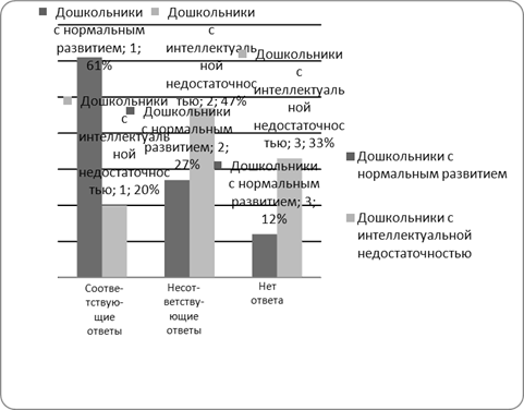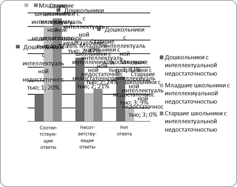 Рисунок 2 – диаграмма соотношения соответствующих и несоответствующих ответов по методике (%) Анализ количественных показателей выявил, что: - ответы детей с интеллектуальной недостаточностью младшего и старшего школьного возраста на большинство рисунков схожи, и при этом значительно отличаются от ответов дошкольников с интеллектуальной недостаточностью (рисунок 2); - нет категорических отказов от ответов; - имеет наличие преобладания соответствующих ответов над несоответствующими в 5 случаях из 8 (70% к 21% - у младших школьников и 76% к 24% - у старших школьников). Проводя качественный анализ полученных данных, нами отмечено, что, во-первых – в младшем школьном возрасте у детей с интеллектуальной недостаточностью сокращается число несоответствующих ответов по методике по сравнению с дошкольным возрастом, это связано с тем, что дети начинают осознавать и понимать изображенные на картинках ситуации межличностных отношений. У детей с интеллектуальной недостаточностью старшего школьного возраста количество несоответствующих ответов минимально (24%), дети хорошо ориентируются в изображенной ситуации, пытаются придумать сюжет, уточняют имена героев. Это также можно связать с тем, что у детей повышается возможность к социализации, а также сказывается работа психолого-педагогического коррекционного воспитания. Во- вторых - следует отметить что чем, старше дети с интеллектуальной недостаточностью, тем меньше отказов и защитных реакций, богаче лексическая сторона ответов. В-третьих - на картинках, где изображено более 2-х человек дети с интеллектуальной недостаточностью младшего школьного возраста выделяют для рассказа часто только 2-е фигуры, а 3-й объект воспринимают, как положительный персонаж (учитель спешит на помощь), что отличает их от восприятия изображения у дошкольников с интеллектуальной недостаточностью. Старшие школьники с интеллектуальной недостаточностью в рассказ включают и третью фигуру. Мы предполагаем, что это связано с недостаточно высоким уровнем обобщения понятий у дошкольников, поэтому часто в обобщенное понятие «человек» дети с интеллектуальной недостаточностью не включают ребенка, у младших и старших школьников данное обобщение уже сформировано. В-четвертых, чаще всего после предъявлении инструкции сохраняется тенденция рассказа детей младшего школьного возраста о взаимодействии взрослых, в основном это лица мужского пола (такая особенность наблюдается и у мальчиков, и у девочек). Старшие школьники включают в рассказ кроме взрослых уже и сверстников, присваивают им имена реально существующих детей. Мы объясняем эту особенность тем, что в старшем школьном возрасте значительно вырастает интерес к сверстникам как объектам межличностных отношений. Математическая статистика нами использована для интерпретации данных исследования второй части эксперимента. Для данной обработки мы взяли Н-критерий Крускала-Уолиса. Критерий предназначен для оценки различий одновременно между двумя, тремя и т.д. выборками по уровню какого-либо признака. Он позволяет установить, что уровень признака изменяется при переходе от группы к группе, но не указывает на направление этих изменений [21, с. 42]. С помощью Н-критерия Крускала-Уолиса мы определим, различаются ли три группы испытуемых по показателям соответствия от