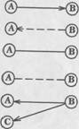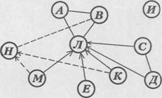 Рис.1. — объект связей в группе (i-член) — субъект связей в группе (j-член) — совмещение объекта и субъекта в поведении одной личности (ij-член) — положительный выбор, совершенный А-членом — отрицательный выбор, совершенный В-членом — взаимная положительная связь А- и В-членов — взаимная отрицательная связь А- и В-членов — уровень связи (член А выбран в первую очередь, член С — во вторую). Социограммная техника является существенным дополнением к табличному подходу в анализе социометрического материала, ибо она дает возможность более глубокого качественного описания и наглядного представления групповых явлений. Анализ социограммы начинается с отыскания центральных, наиболее влиятельных членов, затем взаимных пар и группировок. Группировки составляются из взаимосвязанных лиц, стремящихся выбирать друг друга. Наиболее часто в социометрических измерениях встречаются положительные группировки из 2, 3 членов, реже из 4 и более членов (рис. 2).
