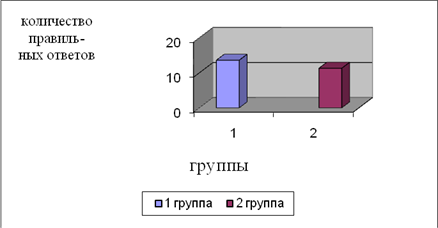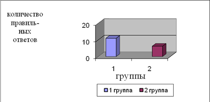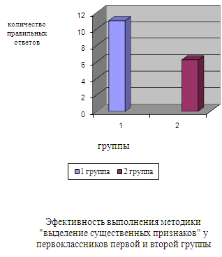 Рис. 6 Эффективность выполнение методики «выделение существенных признаков» По результатам методики «Выделение существенных признаков» (рис.6.) в первой группе результаты выше (11%) чем у второй группы (6,25%). Это говорит о способности дифференциации существенных признаков предметов или явлений от несущественных, второстепенных. Во 2 группе наличие в большей мере ошибочных суждений свидетельствующих о преобладании конкретно-ситуативного стиля мышления над абстрактно-логическим.