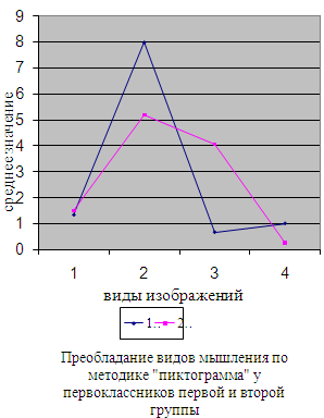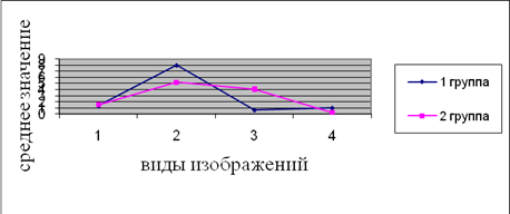 Рис. 9. Преобладание видов мышления по методике «пиктограмма» 1 – абстрактные изображения 2 – конкретные изображения 3 – сюжетные изображения 4 – знаково-символические изображения По результатам методике «Пиктограмма» (рис.9.) в первой группе преобладают конкретные виды изображения, что свидетельствует о большем наличие у испытуемых конкретно-действенного мышления, то есть практического, направленного на разрешение частных конкретных задач в практической деятельности. А также преобладание знаково-символических видов изображения, что позволяет отнести этих испытуемых к типу «мыслителя». Такие испытуемые в мыслительной деятельности стремятся к обобщению, синтезу информации, имеют выше уровень абстрактно-логического мышления. Во 2 группе преобладают сюжетные виды мышления, что указывает на развитость образного мышления, которое проявляется в наличие художественных способностей. А также преобладают по сравнению с 1 группой абстрактные изображения, эти испытуемые в мыслительной деятельности стремятся к обобщению, синтезу информации, имеют выше уровень абстрактно-логического мышления. 4. ОБСУЖДЕНИЕ РЕЗУЛЬТАТОВ По результатам проведенных методик у первой группы мы выявили следующие характеристики: 1. Дети более чувствительные, впечатлительные, спокойные, уравновешенные. Они отличаются утонченностью и хорошим эстетическим развитием, состояние грусти и печали является для них приятным эмоциональным переживанием. Они имеют потребность в глубоком личном, а не поверхностном игровом общении. Для них характерно возможное чувство страха, бесперспективности, которое скрывается от окружающих или проявляется в виде негативизма. 2. Наблюдается явное преобладание положительных эмоций. Ребенок весел, счастлив, настроен оптимистично. Пребывает в состоянии эйфории. 3.Нарастание возможности к сравнению понятий, что говорит о большем наличии понятийных структур, а следовательно наличие понятийного мышления, при котором структурирование воспринимаемой информации осуществляется с использованием объективных категориальных обобщений, а не функциональных, ситуативных, эмоциональных, образных и других субъективных классификаций. Формирование понятийных структур является центральной задачей интеллектуального детского развития, которое не происходит само собой, а зависит от способа передачи знаний, формы организации процесса обучения. 4. Нарастание возможности выделения существенных признаков, что свидетельствует о способности дифференциации существенных признаков или явлений от несущественных, второстепенных 5. Нарастание возможности к исключению лишнего, что говорит о способности к обобщению и абстрагированию и умению выделять существенные признаки. Все это говорит о сформированности у ребенка интеллектуальной установки на иерархическое деление признаков, и испытуемые воспринимают свойства или явления не рядоположенно и равноправно, а соподчинено. Способность к абстрагированию (выделению) отношений в «чистом виде», в отвлечении от каких-либо конкретных предметов, явлений и ситуаций, т. е. от материала, в котором эти отношения выражены помогает ребенку усвоить правило как некий общий принцип действия. 6. Нарастание конкретизации мышления. В следствии этого дети данной группы легче всего адаптируются к школе. У в